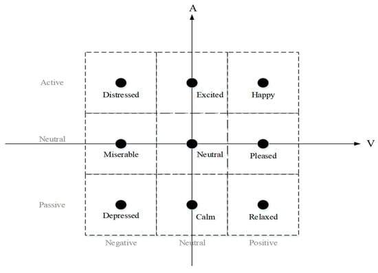 In this study, a scale (ranging from 1 to 9) was mapped on three energy levels for each valence and arousal state. The valence-state values of 1–3 were mapped as “negative”, 4–6 as “neutral”, and 7–9 as “positive”. Similarly, the 1–3 arousal-scale values were mapped as “passive”, and 4–6 and 7–9 as “neutral” and “active”, respectively. According to the new proportional mapping, the model provided an emotional classification of nine states, as shown in Figure 3. The 4500 samples were evenly distributed in nine categories of emotions: depressed, calm, relaxed, miserable, neutral, pleased, distressed, excited, and happy, with 500 samples in each category.
