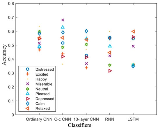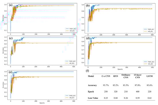 We used several deep learning models to conduct classification experiments, including the 13-layer CNN, LSTM, RNN, C-c CNN, and non-C-c CNN (an ordinary CNN) models [21]. The experiment was conducted using Keras, with TensorFlow as the backend. The experimental results are shown in Figure 4. All experiments used tenfold cross-validation, and the training process curve was plotted for each case. Figure 4 shows that after 320 rounds of training, with the fluctuation in the RNN, the classification accuracy finally reached approximately 85.2%. For the ordinary CNN, we added a batch normalization (BN) layer and applied the dropout method. From the 210th round onward, the model exhibited a classification accuracy of 83.5% for the verification set. The accuracy of the 13-layer CNN model [21] reached 87.8% after 210 rounds; however, it showed slight fluctuations, as in the case of the RNN. The accuracy of the LSTM model was stable at 85.6% after 220 rounds of training. These experimental results showed that the convergence speed of the network was faster, and the trained results was more stable when a BN layer was used. Moreover, the number of iterations was reduced from 320 in the RNN to 210 in the proposed model, which indicated that the training time was substantially shortened. The BN layer and dropout method were used in the model presented in this study. The values of the three evaluation indicators were calculated, and the results are presented in Figure 4f.