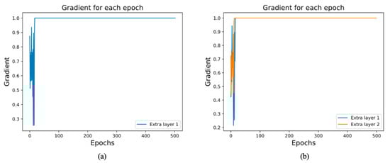 Subsequently, we extracted the gradient of the excess layer, as shown in Figure 8. From the line graph, we noted that when the extra layer was backpropagated to update the weights, the layer gradient was maintained at 1, which meant that the layer weight was not updated during training. The three-layered C-c CNN extracted all features of interest. The new test layers were completely redundant and did not aid in model classification; the new layer decreased the model performance. This situation arose not because of overfitting, but because of the same problem as that underlying the ResNet reaction. Thus, it is not always better to have more layers, as the structure of the three convolutional layers was sufficient to extract the required features.