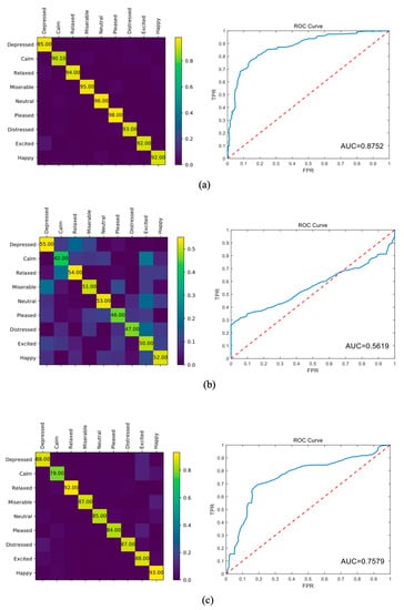 For this experiment, we plotted the confusion matrix and receiver operating characteristic (ROC) curve for the analysis, as shown in Figure 9. Because emotion classification is a multiclassification problem, the method of drawing an ROC curve is different from that of the two-class problem. First, we preprocessed all labels using one-hot encoding. The preprocessing labels consisted of only zero and one, where the position of one indicated its category (corresponding to “positive” in the two-category problem) and zero indicated other categories (corresponding to “negative” in the two-category problem). If the classifier classified the test sample correctly, the value of the position corresponding to one in the sample label in the probability matrix was greater than that corresponding to zero.