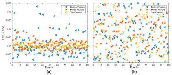 We speculate that this is because the features extracted by the different channels were different in the removed channels, and only a few specific channels may have contained important information. Thus, we separately extracted the data from different channels and inputted them into our model for analysis. We extracted the feature distribution maps from the data in Figure 9b,c, as shown in Figure 10, and calculated the power spectral density (PSD) features of the EEG signals.