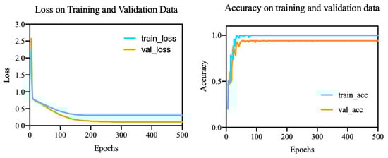 The details of the three parallel training channels of the model are presented in Table 1, Table 2 and Table 3. The Adam optimizer, configured with a learning rate of was used to learn the weights. The loss function selected the categorical cross-entropy; the evaluation criterion was accuracy, the batch size was 64, and the number of epochs was 500.