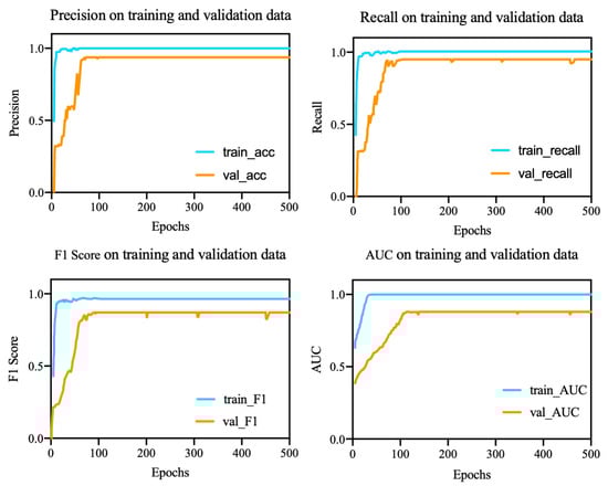 Figure 11 shows the loss function and the accuracy of the model. As the epoch increased, the loss function gradually decreased and reached a steady-state value after the 180th epoch. The accuracy tended to stabilize as the epochs approached 100. We used ten-fold cross-validation. The precision, F1 score, recall, and area under the ROC curve (AUC) were used as evaluation criteria for the model, and the results are shown in Figure 12.