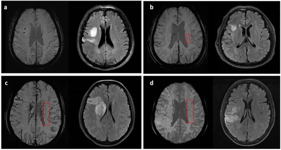Examples and demonstrations of the four-grade DMVs (marked in the red box) scoring method on SWI with corresponding infarction lesions: (a) grade 0, no visible conspicuous and continuous DMVs; (b) grade 1, <5 conspicuous DMVs; (c) grade 2, 5–10 conspicuous DMVs; (d) grade 3, >10 conspicuous DMVs.