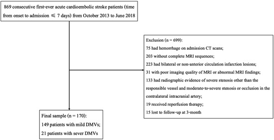 Accounting for 15–30% of ischemic stroke and resulting in a sudden occlusion in the intracranial artery [23,24], cardioembolic stroke patients may experience more dramatic changes in microcirculation status and have poorer establishments of collateral circulations [25,26]. Both the pathophysiological processes can affect the appearance of DMVs, as mentioned above. Additionally, a recent prospective study indicated that cardio-embolism might be independently associated with the prominent vessel sign on SWI [27]. It was proposed that cardioembolic thrombus of medium to large size could both lead to the presence of prominent DMVs under the circumstance of acute cerebral parenchymal and/or cortical ischemia. Generally, patients with cardioembolic stroke are more likely to suffer large infarcts, greater stroke severity (higher admission NIHSS (National Institutes of Health Stroke Scale)), and worse functional outcomes than patients with non-cardioembolic stroke [1,3,24,28]. To date, little is known about the association between DMVs and clinical outcomes of acute cardioembolic stroke patients. Considering the potential influence of infarction lesion and edema on DMVs, the aim of this study was to explore the relationships between DMVs in the unaffected hemisphere and functional outcome in acute cardioembolic stroke patients.