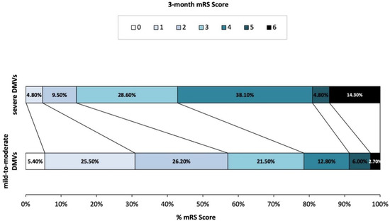 A total of 170 acute cardioembolic stroke patients without reperfusion therapy were finally included in the present study (Figure 2). Baseline information was presented in Table 1. Among the 170 patients, the median age was 72 years old (IQR 60–78) and 40% of them were males. The baseline median NIHSS score was 8 (IQR 4–13). Of the included participants, 140 (82.4%) patients had atrial fibrillation, 42 (24.7%) patients had rheumatic heart disease, 14 (8.2%) had congestive heart failure, 14 (8.2%) had mitral valve stenosis, and 1 (0.6%) patient had infective endocarditis. After admission, 137 (80.6%) patients received treatments of an antiplatelet and 53 (31.2%) received an anticoagulant. At three months, the severe DMVs group had higher mRS scores (4 (3–4) vs. 2 (1–3), p = 0.002). Additionally, the distribution of mRS scores was significantly different between patients with severe DMVs and those with mild DMVs (p = 0.002, Figure 3).