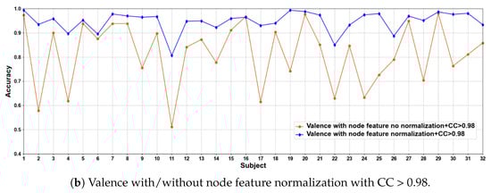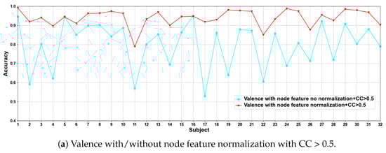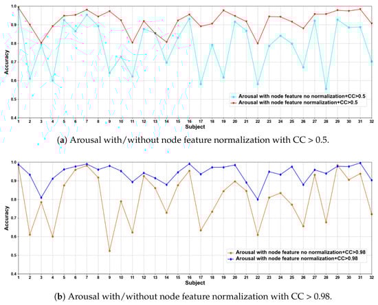 We compare the classification results of node feature normalization and no normalization. It can be seen that whether CC > 0.5 or CC > 0.98, the normalization of node feature is better than no normalization in most cases. In particular, the method has higher model performance accuracy when the CC > 0.98. At the same time, the average classification accuracies on all subjects are calculated. Results are shown in Table 5.