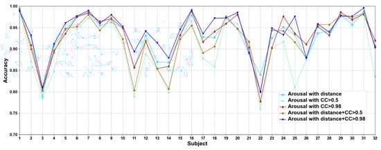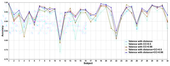 We compare different construction methods of adjacency matrix. It can be seen that although the effect of distance-based method is better than that functional connectivity-based method in most cases, there are also some subjects in the functional connectivity-based method achieve better performance than distance-based method, as in valence sub7, sub8, and sub10, etc., in arousal sub8, sub 9, and sub10, etc. This shows that only relying on the distance-based adjacency matrix (which tends to study local relationships) to construct the adjacency matrix without considering the correlation among channels (which tends to study global relationships) is not good for classification. It can be seen that the adjacency matrix based on the combination of distance and functional connectivity has the best classification effect when the CC > 0.98. At the same time, the average classification accuracies on all subjects are calculated. Results are shown in Table 6.