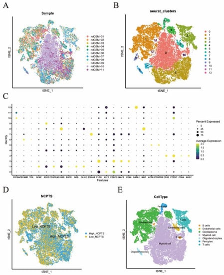 The GSE182109 single-cell glioma dataset was downloaded from the GEO database (https://www.ncbi.nlm.nih.gov/geo/, accessed on 19 May 2022) and 11 GBM samples from 44 glioma patients were selected for analysis [31]. To assure data quality, the cells selected for this study set the screening criteria as less than 20% of mitochondrial genes, more than 200 genes, and gene expression between 200 and 7000, and containing more than three genes. The number of highly variant genes was 3000. Samples were integrated using SCT correction. Next, data dimensionality was reduced by setting the “DIMS” parameter to 25 and using the TSNE method. The clustering of cells was performed using the “KNN” method. Cells were subsequently annotated using different cell surface markers. Finally, NCPS genes were imported using the “AddModuleScore” function to determine the percentage of NCPS-related genes in each cell.