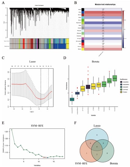 Nowadays, next-generation sequencing (NGS) technologies allow us to explore the variation of thousands of molecules at multiple omics levels, but how to choose the right and accurate variables in a high-dimensional computation, machine learning is a promising algorithm for computing such problems [22]. Some of the popular machine learning algorithms include the Least Absolute Shrinkage and Selection Operator (LASSO), Support Vector Machine (SVM), and Random Forest (RF). LASSO [23] is a regression method that is of great importance in datasets with many variables and supports unbiased parameter selection. SVM is an algorithm that efficiently handles problems by using a non-linear kernel function [24,25], while recursive feature elimination (RFE) is a popular method of variable selection at the multi-omics level [26,27]. In this research, we used support vector machine recursive feature elimination (SVM-RFE) to dimensionally reduce the search for suitable variables. Random Forest is an integrated algorithm based on decision trees [28]. The Boruta algorithm is a wrapper around the Random Forest algorithm, allowing the algorithm to iteratively remove less relevant features determined by statistical tests [29].