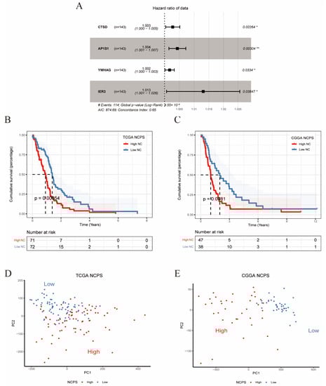 Multivariate Cox and survival analysis. (A) Hazard ratio and p-value of constituents involved in multivariate Cox regression and some parameters of the signature. (B) Survival analysis of TCGA cohort. The prognosis was significantly worse in the high-NCPS group (p < 0.001). (C) Survival analysis of CGGA cohort. The prognosis was significantly worse in the high-NCPS group (p < 0.01). (D,E) PCA analysis in TCGA cohort and CGGA cohort. It was found that the model could group GBM patients well in both the training cohort and the validation cohort. * p < 0.05; ** p < 0.01.