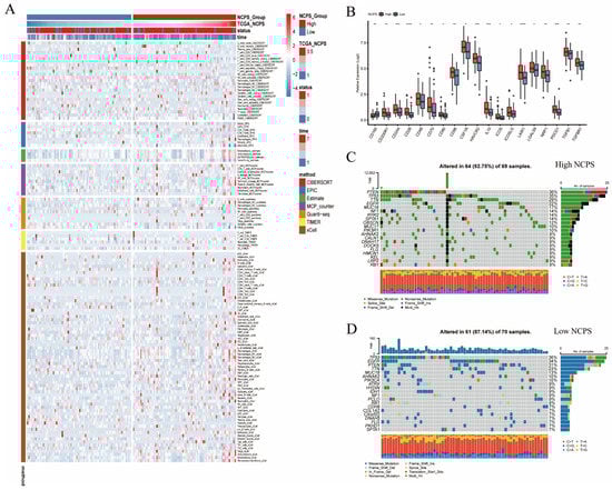Immune infiltration analysis and mutation landscape. (A) Heat map of immune cell infiltration in the high NCPS group and low NCPS group. (B) Expression of immune checkpoint-related genes in the high NCPS group and low-NCPS group. The results showed that the expression trend of immune checkpoint-related genes was higher in the high NCPS group. (C) Mutation landscape of TCGA cohort in the high-NCPS group. (D) Mutation landscape of TCGA cohort in the low-NCPS group. * p < 0.05; ** p < 0.01; *** p < 0.001; **** p < 0.0001.