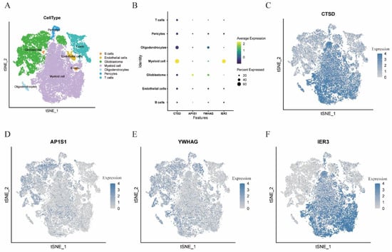 Single-cell sequencing analysis to explore the cell localization of 4 modeling genes. (A) The location of different cell types in GBM. (B–F) CTSD expression was highest in myeloid cells, high expression of AP1S1 was shown in glioblastoma cells, YWHAG was mainly expressed in glioblastoma cells, oligodendrocytes, and myeloid cells, and IER3 was predominantly expressed in myeloid cells.