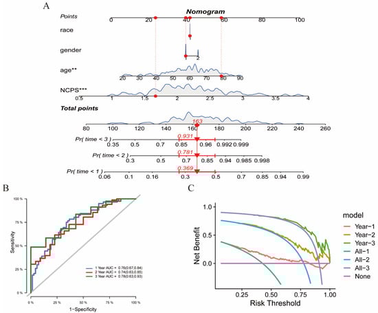 The construction of a nomogram. (A) Nomogram of patient “TCGA-02-0047”. The mortality rates at 1, 2, and 3 years were estimated from the “TCGA-02-0047” patients by gender, age, race, and NCPS scores of 0.369, 0.781, and 0.931, respectively. (B) ROC curve of the nomogram. The area under the curve (AUC) in 1, 2, and 3 years were 0.76, 0.74, and 0.78, respectively. (C) Decision curve analysis. This method is effective in predicting the prognostic survival time of patients. ** p < 0.01; *** p < 0.001.