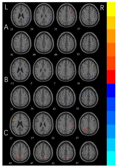Post hoc comparisons of differences in the ReHo values among the checking group, washing group, and healthy controls. (A) Brain regions showing ReHo differences between the checking group and washing group. (B) Brain regions showing ReHo differences between the checking group and HCs. (C) Regions showing ReHo differences between the washing group and HCs. Warm colors show brain areas with increased ReHo values, while cool colors show decreased ReHo values.