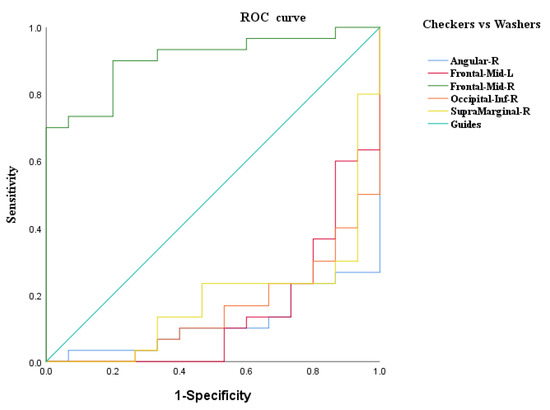 ROC curve analysis of ReHo differential brain regions between the checking and washing groups.