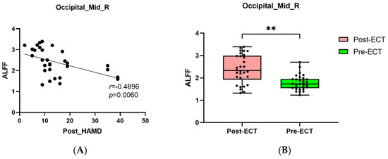 (A): The negative correlations between HAMD scores after ECT and ALFF in the Occipital_Mid_R (p = 0.0060). (B): MDDs showed increased ALFF in Occipital_Mid_R after ECT (** p < 0.01).