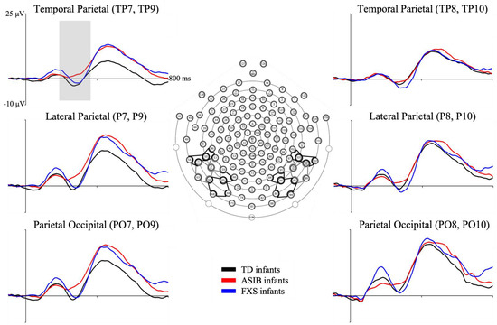 Figure 3. Grand average N290 responses by group at left and right parietal–occipital (PO; left: PO7 and PO9, right: PO8 and PO10), lateral–parietal (P; left: P7 and P9, right: P8 and P10), and temporal–parietal (TP; left: TP7 and TP9, right: TP8 and TP10) electrode clusters. Inferior posterior electrode clusters of interest are presented on the diagram of the electrode layout for the Electrical Geodesics, Inc. (EGI) Hydrocel Geodesic Sensor Net. This figure was first published in Guy, Richards, Tonnsen, and Roberts (2018) [4]. Note. TD = typical development, ASIB = infant sibling of child with autism, FXS = fragile X syndrome.
