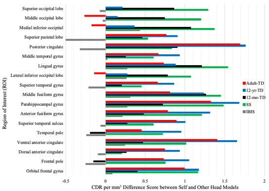 Figure 5. Difference scores calculated by subtracting the CDR for the IBIS, study-specific (SS), 12-mo-TD, 12-yr-TD, and Adult-TD head models from the CDR for the Self model at each ROI.