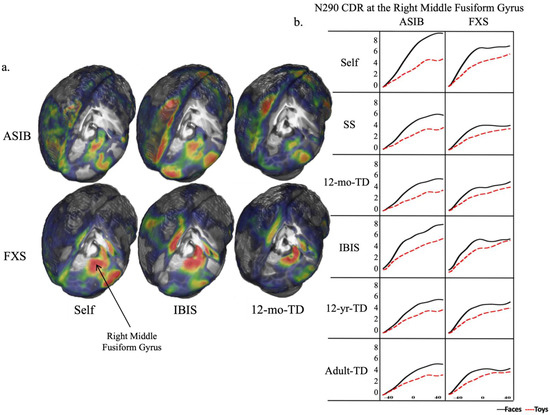 Figure 6. (a). Areas and degree of CDR activation are presented on Self, IBIS, and 12-mo-TD whole-head models separately for ASIBs and infants with FXS; warmer colors indicate greater activation; (b). Patterns of CDR activation are depicted at the right middle fusiform gyrus during the time window of the N290 separately for ASIBs and infants with FXS for each head model examined.