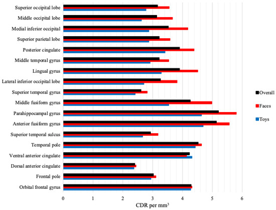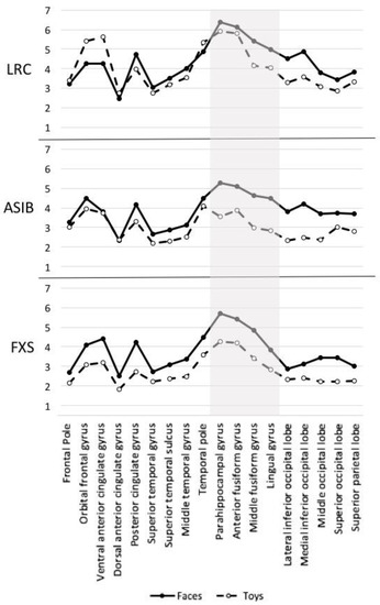The source analysis CDR values were analyzed as a function of the stimulus type, group, and ROIs. Figure 7 presents overall CDR activation, as well as CDR to faces and toys, at each ROI examined across participant group. It is apparent that activation was the greatest in the anterior fusiform gyrus and parahippocampal gyrus, but that the greatest differentiation between CDR to faces and toys was observed at the middle fusiform gyrus. These effects were significant. A group (3: ASIB, FXS, LRC) by stimulus type (2: faces, toys) by ROI (18: see above) ANOVA was completed. There was a significant main effect of stimulus type, F (1, 55) = 21.47, p < 0.001. ROI activation was higher in response to faces (M = 4.08) than toys (M = 3.31). There was also a main effect of ROI, F (17, 935) = 27.67, p < 0.001. CDR activation was greatest across groups and stimulus types in the anterior fusiform gyrus (M = 5.13) and parahippocampal gyrus (M = 5.21). There was a stimulus type by ROI interaction, F (17, 935) = 4.91, p < 0.001. Activation was greater to faces than toys at all ROIs except for the ventral anterior cingulate. Activation to faces (M = 4.98) and toys (M = 3.53) was most differentiated at the middle fusiform form gyrus. Finally, there was a significant group by stimulus type by ROI interaction, F (34, 935) = 1.45, p = 0.047. Figure 8 presents CDR activation to faces and toys separately for each participant group across all ROIs examined. Infants with FXS demonstrated greater activation to faces than toys across all ROIs, and ASIBs demonstrated greater activation to faces at all ROIs except for the dorsal anterior cingulate. LRC infants showed evidence of greater specialization of specific areas for face processing. This was shown in greater activation to faces than toys in most ROIs, but not the dorsal anterior cingulate, frontal pole, orbital frontal gyrus, temporal pole, and ventral anterior cingulate.