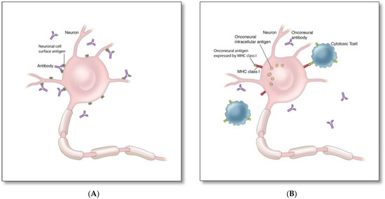 The second mechanism involves cytotoxic T cell-mediated neuronal destruction associated with antibodies against cytoplasmic (e.g., Yo, CV2/CRMP5) or nuclear onconeural antigens (e.g., Hu, Ri) (Figure 1B) [9,10,11]. These antibodies are not directly harmful, but rather serve as biomarkers for the concurrent pathogenic cytotoxic T cell-mediated autoimmunity [9,10,11], which is typically associated with limited response to treatment and worse neurological outcome due to rapid neurodegeneration, despite treatment [8].