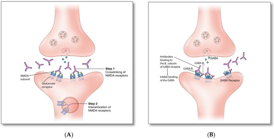 There are two proposed immune mechanisms in autoimmune encephalitis [9,10,11,12,13]. The first involves autoantibodies against synaptic surface structures (e.g., receptors, ionic channels, or supporting proteins) (Figure 1A) [8]. These antibodies cause neuronal dysfunction by altering synaptic transmission through cross-linking and internalization of the receptors such as anti-NMDAR antibodies (Figure 2A), preventing neurotransmitter binding such as anti-GABAB receptor antibodies (Figure 2B), or disrupting ion channel function such as anti-VGKC and anti-LGI1 antibodies (Figure 2C) [8]. Thus, the clinical outcome is generally favorable if diagnosed and treated early, as these antibodies do not directly damage neuronal structures or produce significant neuronal apoptosis cell bodies in early phase [12,13].