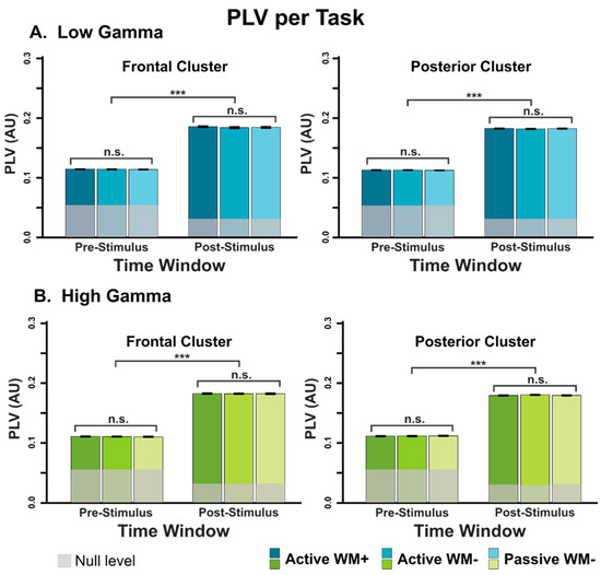 Average PLV per task across the different clusters and frequency bands. The shaded areas on each bar represent the PLV of the null permutations and mark the PLV one would expect by chance. When marking significance, *** denotes p < 0.001.