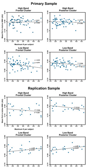 We found that there was no significant association between individual PLV values and K for either the frontal or posterior electrode cluster, or for high or low gamma in either the primary sample (abs(r’s) < 0.232; p’s > 0.075) or the replication sample (abs(r’s) < 0.480; p’s > 0.032) after correction. In the replication sample, the correlation between the low band posterior cluster PLV and K was significant before correction (r = 0.480, p = 0.032). However, this comparison failed to remain significant after FDR correction was applied. Furthermore, the equivalent comparison in the primary sample was not significant (r = −0.200, p = 0.126), suggesting that the observed correlation is unlikely to reflect a consistent relationship between PLV and K. To visualize the associations between PLV and K, we plot the average PLV and K across the different clusters, frequency bands, and samples in Figure 5.