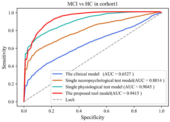 Recently, MCI screening has attracted immersive interests. A Neuropsychological Tests Battery (NTB) is well recognized in the diagnostic pipelines of preclinical AD [15]. Multiple preclinical neuropsychological measures significantly predicted progression to AD from MCI and detected changes in patients in verbal and visual memory, visuospatial processing, error control, and subjective neuropsychological complaints [16]. Paul et. al. confirmed that neuropsychological tests quick-MCI to assess cognitive status in 3–5 min and can discriminate MCI accurately in primary care [17]. Neuropsychological tests were clearly appropriate for MCI community screening, as are emerging cognitive assessments such as electroencephalogram (EEG) and eye tracking (ET) to monitor cognitive function. Murty et al. found that stimulus-induced gamma rhythms from EEG were significantly lower in MCI/AD subjects compared to their age- and gender-matched controls, suggesting that gamma of EEG could be used as a potential screening tool for MCI or AD in humans [18]. Oyama et al. developed a brief cognitive assessment utilizing an eye-tracking technology that can enable quantitative scoring and the sensitive detection of cognitive impairment in patients with mild cognitive impairment and dementia [19]. Nie et al. found that eye movement parameters are stable indicators to distinguish patients with MCI and cognitively normal subjects and are not affected by different testing versions and numbers [20]. The incorporation of neuropsychological tests and physiological measurements warrants further study as a practical and cost-effective method for wide-scale screening for identifying older adults who may be at risk for pathological cognitive decline. Neuropsychological tests might be limited in their effectiveness in MCI screening while acknowledging that neuropsychological tests are inadequate for making a definitive diagnosis. To increase the precision and sensitivity of MCI screening, several researchers incorporated NTB into objective physiological measures, such as prefrontal EEG [21] and ET [22]. For instance, our previous work validated the feasibility of physiological measures using EEG and ET in distinguishing MCI from HC, with a classification accuracy of 81.5% [23].