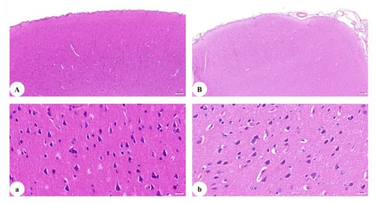 H&E staining of the cerebral cortex: (A) section of the cerebral cortex of healthy monkey (50×); (B) section of the cerebral cortex of the SHIVKU-1-infected monkey brain (50×); (a) section of the cerebral cortex of healthy monkey (400×); (b) section of the cerebral cortex of the SHIVKU-1-infected monkey brain (400×).