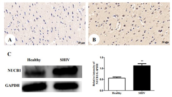 NUCB1 protein expression in cerebral cortex: (A) the healthy control (400×); (B) SHIVKU-1-infected monkey (400×) (C) comparison of NUCB1 expression of cerebral cortex in healthy control and SHIVKU-1-infected monkey using Western blotting. In the column, from the t test, statistically significant differences of the two groups can be determined (p = 0.0056). ** p < 0.01.