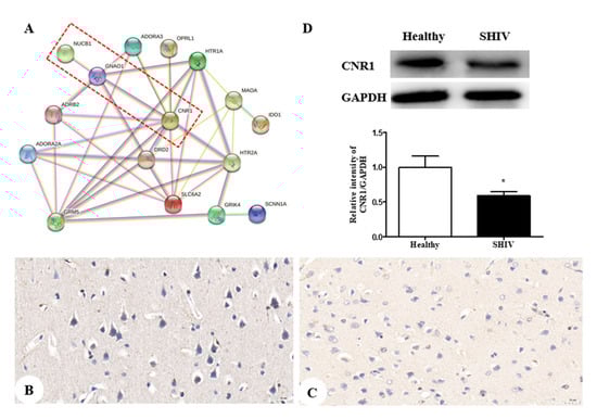 The network showed CNR1, neuroprotective and highly expressed in the neurons [,], is in close contact with NUCB1 (Figure 4A). Thereby, we investigated the impact of SHIVKU-1 infection on CNR1 expression in neurons. Accordingly, we observed, using an immunohistochemical technique, the down-regulation of CNR1 protein expression in the infected monkey compared to the healthy control (Figure 4B,C). This was supported by protein levels of CNR1 via Western blot analysis (p = 0.0366) (Figure 4D). We speculate that decreased CNR1 expression by SHIVKU-1 infection results in depressive disorder because there is support for existing cannabinoid signaling pathways that can decrease neuronal injury [].