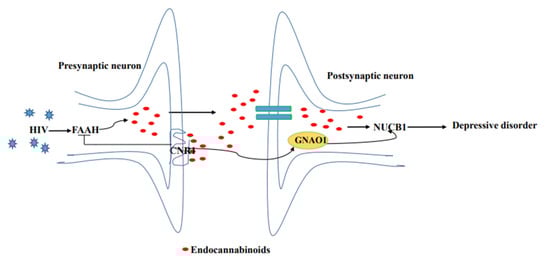 Several studies have showed that HIV gp120 stimulates increased cortical fatty acid amide hydrolase (FAAH) [,], subsequently allowing for rapid 2-AG and AEA production [], selective ligands for the NUCB1 linked to degree of depressive behavior [], in the postsynaptic neuron, whereas decreased CNR1 expression promotes the release of 2-AG and AEA [,]. Herein, down-regulation of CNR1 expression and up-regulation of NUCB1 expression in neurons were found in the co-occurrence of depression disorder and SHIV infection, as detected by IHC and Western blot. By combining our experimental results, we propose a schematic presentation of a possible mechanism of NUCB1 involvement in depression in PLWH (Figure 5). Therefore, NUCB1 inhibition may be considered as a therapeutic agent to relieve depressive disorder. Based on the published articles, we speculate that both a ZiBuPiYin recipe [], which was recorded in the book of Bujuji written by Cheng Wu in the Qing dynasty, and Luks-PV [] which is a pore-forming leukocidin secreted by Staphylococcus aureus, have potential roles in the prevention and treatment of depression because of their reductions in the levels of the NUCB1 protein.