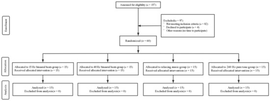 A total of 60 right-handed male subjects with visual acuity or corrected visual acuity of 1.0 and without any history of neurological or psychiatric disorders or substance abuse were recruited. They were randomly assigned to four groups by means of a random number: (1) 15 Hz binaural beats group (intervention); (2) 40 Hz binaural beats group (intervention); (3) relaxing music group (intervention); and (4) 240 Hz pure tone group (control). All subjects had normal sleep quality in the previous month (Pittsburgh Sleep Quality Index (PSQI) score < 16 and Epworth Sleepiness Scale (ESS) score < 10) and the Morningness–Eveningness Scale (MES) scores were moderate to intermediate (31 < scores < 69). The basic information regarding the subjects is shown in Table 1 and a CONSORT flow diagram is shown in Figure 1. All subjects were asked not to consume excitatory beverages or food such as coffee, alcohol, or tea 24 h before the experiment. All subjects volunteered to participate in the experiment and completed a written informed consent form. This study was conducted according to the Declaration of Helsinki and was approved by the Ethics Committee of Tangdu Hospital (2014-03-03), and has been registered with ClinicalTrials.gov (NCT02420470, http://www.clinicaltrials.gov/, accessed on 1 March 2022).