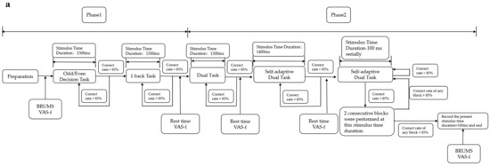 In phase 2, participants carry out a dual task combining the odd/even decision task and the 1-back task. In this phase, stimuli are presented in the sequence of “digit-letter-digit-letter” with a stimulus time duration of 1500 ms. The accuracy rate in this phase is calculated using a weighted calculation method in which the accuracy rate for the odd/even decision task accounts for 35%, and the accuracy rate for the 1-back task accounts for 65%. If the total accuracy rate does not reach 85%, another block with a duration of 1500 ms is performed until the minimum accuracy rate is met. When the total accuracy rate reaches 85%, a double task with a reduced presentation time of 1400 ms per stimulus is performed. When the accuracy rate meets 85% again, the duration in the next block is shortened by 100 ms overall. This step continues until the total accuracy rate falls below 85%. When it falls below 85% for the first time, two blocks are given with the same stimulus duration as the failed block; if the weighted accuracy rate in each of these two blocks is below 85%, the stimulus duration of that time plus 100 ms is recorded, which is the final stimulus duration used for day 2, and the procedure for day 1 is finished. However, if the accuracy rate in any of the two blocks is higher than 85%, the stimulus duration continues to decrease by 100 ms from this block until the final stimulus duration is obtained. On day 1, at the end of each block of phase 1 and phase 2, participants are reminded to rest and asked to complete the Visual Analogue Scale-Fatigue (VAS-f) to ensure that their mental state has not changed too much.