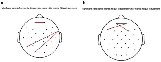 Diagram of the functional connection of the 240 Hz pure tone group in the eyes-opening state: (a) theta band; (b) alpha band.