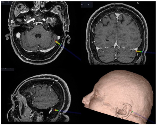 - Da Silva, E.B.; Leal, A.G.; Milano, J.B.; Da Silva, L.F.M.; Clemente, R.S.; Ramina, R. Image-guided surgical planning using anatomical landmarks in the retrosigmoid approach. Acta Neurochir. 2009, 152, 905–910. [Google Scholar] [CrossRef]