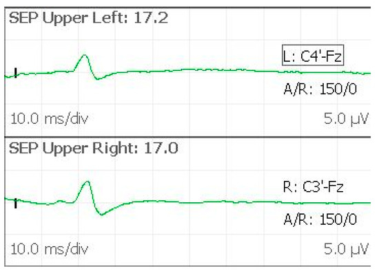 SEPs evoked from upper limbs, with the N20 peak symmetrically observed.