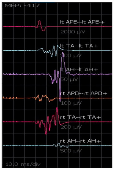 MEPs monitoring allows the ongoing assessment of motor tract function during the operative procedure [14]. Transcranial stimulation activates spinal motor pathways selectively, producing compound muscle action potentials (CMAPs). Because of the variability of activation of low-threshold spinal alpha motor neurons by each descending corticospinal volley, sequential transcortical electric stimuli produce CMAPs that could vary significantly in waveform, amplitude, and morphology (Figure 6). The produced CMAPs are generally associated with some movements of the patients, even in the presence of incomplete anesthesiological muscle blockade [15]. MEPs are recorded with the following parameters: C1–C2 (anodal), train of stimuli 5–7 pulses, 500 µs pulse duration, 250–500 Hz. Stimulus intensity required for effective transcranial stimulation varies significantly among patients, and individual adjustment to obtain the best response without extreme muscular activation is necessary. We generally perform MEPs intermittently rather than continuously, especially during critical surgical steps where patient movements are not desirable. No well-defined guidelines exist regarding MEP interpretation. In our practice, we consider a critical reduction in amplitude and wave complexity not otherwise explained a signal of potential damage, even though sometimes the final clinical outcome correlates simply with the presence vs. absence of CMAP responses. Moreover, provided stable anesthesia and neuromuscular blockade are achieved, the increase in voltage threshold needed to induce a CMAP response, unexplained by other factors, is used as an alert of potential motor tract injury [16].