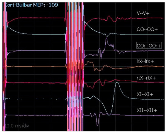 cMEPs registered from V, VII, X (left and right), XI, and XII cranial nerves.