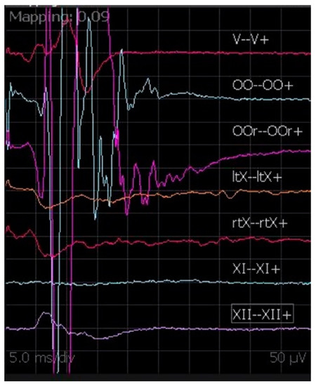 - Strommen, J.A.; Crum, B.A. Intraoperative monitoring with free-running EMG. In Handbook of Clinical Neurophysiology; Elsevier: Amsterdam, The Netherlands, 2008; Volume 8, pp. 396–403. [Google Scholar] [CrossRef]