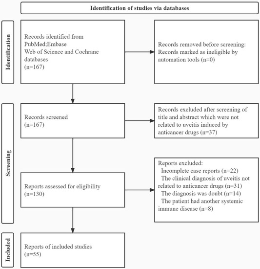 The search queries “Neoplasms/drug therapy” [Mesh] and “Uveitis” were used to search for articles in PubMed, Embase, Web of Science, and Cochrane. The literature from January 2011 to October 2020 was included. The studies were included only if there was a clinical diagnosis of uveitis related to anticancer drugs. If the diagnosis was in doubt, no diagnosis was made, there was no clear relationship between uveitis and anticancer drugs, or the patient had another systemic immune disease, the paper was excluded (Figure 1). We collected all the basic information, including age and sex of the patient; type of cancer; time to occurrence of uveitis; clinical information of uveitis, including the manifestations under the slit lamp, fundus examination and auxiliary examination; the course of treatment, prognosis, and whether the use of anticancer agents was halted. The anatomical classification was conducted according to the standardisation of uveitis nomenclature (SUN) as anterior uveitis, intermediate uveitis, posterior uveitis, or panuveitis [9]. The patient’s visual acuity was converted to a logarithm of the minimum angle of resolution (LogMAR). The hand motion record was 3.0, the light perception record was 4.0, and the no light perception record was 5.0. To study the clinical features of uveitis caused by different anticancer drugs, we divided all cases into three groups, immunotherapy, specific targeted therapy, and other anticancer drugs. The clinical characteristics of uveitis in patients were described by calculating the frequency of each feature in these cases. Chi-square and Fisher exact tests (Software SPSS Statistics 28.0, International Business Machines Corporation, New York, NY, USA) were used to compare the differences in uveitis between the immunotherapy and specific targeted therapy groups. Independent sample t-tests were used to compare the visual acuity at presentation and the time from treatment to onset between the two groups. p values of less than 0.05 were considered statistically significant. This study met the requirements of the Declaration of Helsinki and was approved by the Clinical Ethics Committee.