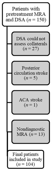 Among the 150 patients evaluated, a total of 104 patients (59 female) were ultimately included (Figure 1). In 27 patients, the baseline (before thrombectomy) catheter angiograms were deemed insufficient for assessment of collaterals due to limited angiographic runs or inadequate head coverage. In an additional 13 patients, the pre-treatment MRA was nondiagnostic for the evaluation of collaterals.