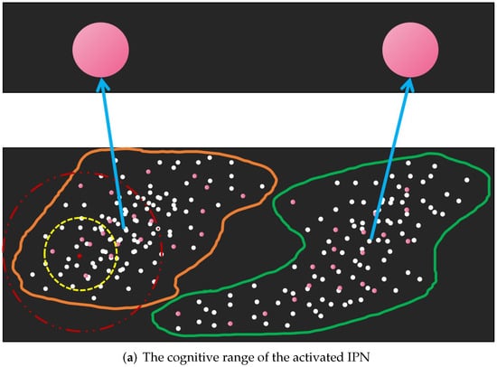 The interactive stimulation may be unidirectional for some PNs. In NMIS’s primary field, each PN has a resting activation. If a PN has not established the inter-field connection with an SN, it is called an implicit primary neuron (IPN). The resting activation of all IPNs is a uniform value and named the intrinsic resting activation [51,52,53]. The other PNs are called explicit primary neurons (EPN). The IPNs cannot receive interactive stimulation from other PNs, but the activated IPNs can exert interactive stimulation on EPNs. So, the IPNs can only be activated by the external input stimulation from their corresponding instances. Although the activation of neurons is generally positive, to prevent the PNs from being in an excitable state for a long time, we set their resting activation to be a negative value. In particular, the resting activation of the IPNs should be so small that they cannot be activated by the interactive stimulation from other PNs. Similar properties are also applied to SNs. We abbreviate the explicit senior neuron to ESN and the implicit senior neuron to ISN.