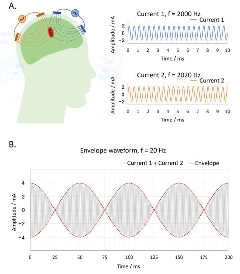 Schematic diagram of TI-tACS. (A) Stimulation of a specific area in the deep brain by TI-tACS, which has two pairs of electrodes with high-frequency alternative currents (e.g., 2000 Hz and 2020 Hz). (B) Low-frequency envelope-modulated current waveform of TI-tACS (e.g., 20 Hz) that is generated by the superposition of the two high-frequency current waves shown in (A). TI-tACS: temporal interference transcranial alternating current stimulation.