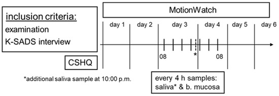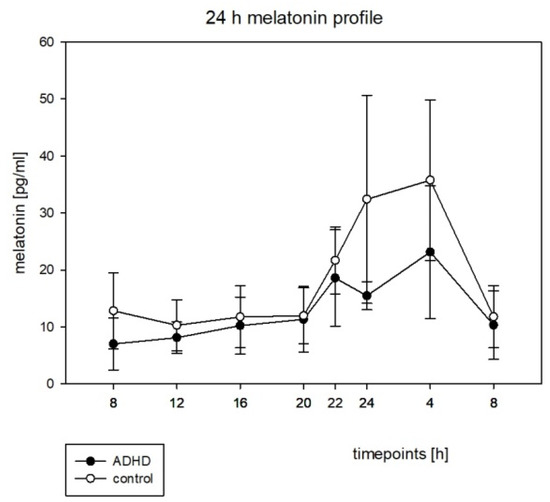 - Nováková, M.; Paclt, I.; Ptáček, R.; Kuželová, H.; Hájek, I.; Sumová, A. Salivary melatonin rhythm as a marker of the circadian system in healthy children and those with attention-deficit/hyperactivity disorder. Chronobiol. Int. 2011, 28, 630–637. [Google Scholar] [CrossRef]