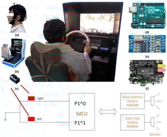 Experimental equipment diagram (a) Neuroscan (b) JT/T378 (c) response switch (d) Arduino UNO R3 (e) speech synthesis module SYN6288 (f) speech chip ISD4004.