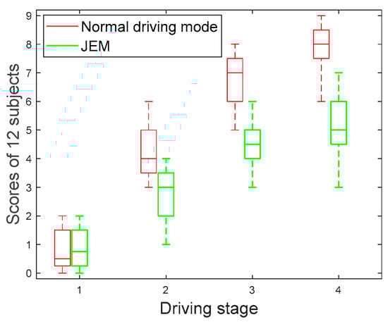 In Figure 2, the fatigue degree of subjects in both driving modes showed an increasing trend with the progression of driving stages. However, it is obvious that the speed of subjects’ fatigue increase in the JEM is lower than that in the normal driving mode, and there is a significant difference (|t| = 2.946, t0.05,12 = 2.179, p < 0.05) between the two driving modes. This means that the JEM can improve the subjects’ driving interest and neural activity by increasing cognitive load. The results of the subjective questionnaire show that the proposed JEM can effectively alleviate subjects’ driving fatigue.