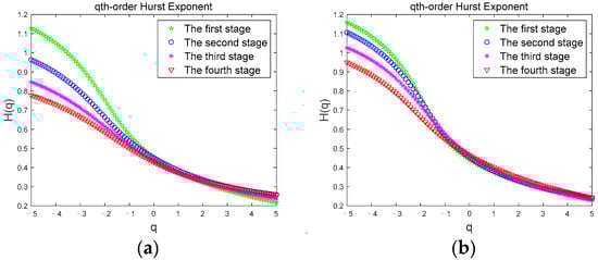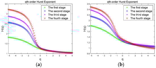 According to Equation (11), h(q) (Hurst exponent) is the slope obtained by linear regression. Hurst exponent was proposed by H.E Hurst of Britain. It is used to analyze the time correlation of time series and to judge whether there is chaos in the data, and is sensitive to slight changes in the characteristics of the series []. The scaling behavior with different amplitude fluctuations can be described according to the q value. For example, the scaling behavior with large amplitude fluctuation corresponds to a larger q, and the scaling behavior with small amplitude fluctuation corresponds to a smaller q. A single order corresponds to a Hurst exponent, which depends on q and is called qth-order Hurst exponent, as shown in Equation (11). For example, when q = 2, the scale exponent h(2) is called the classical Hurst exponent.